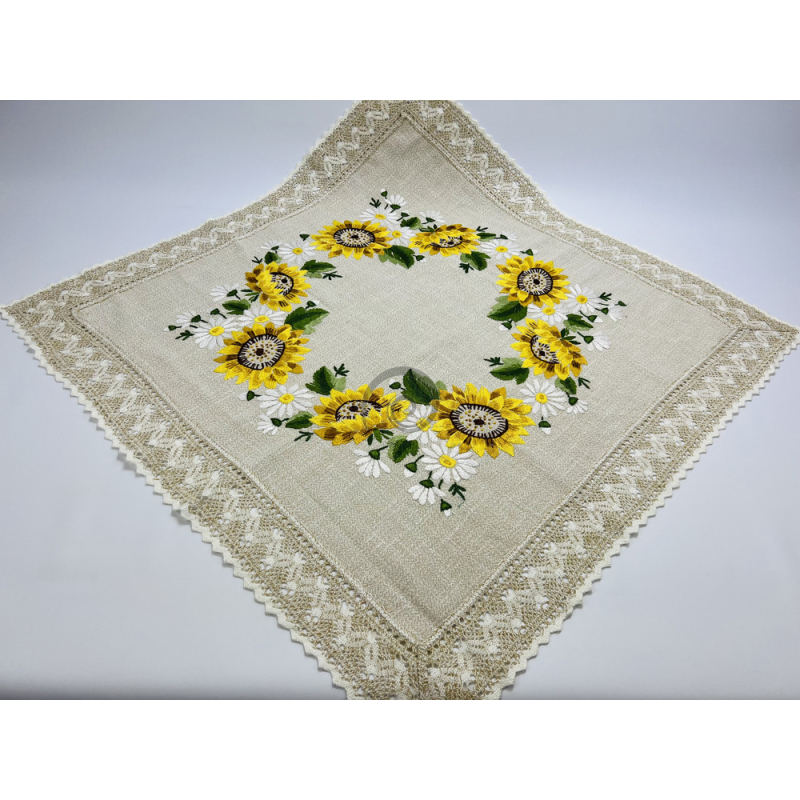 Vyšívaný obrus s krajkou - slnečnice 95x95cm
